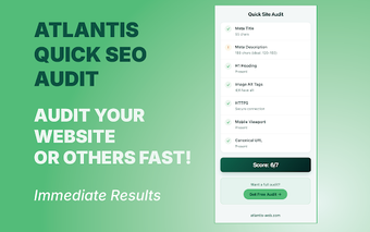 Atlantis Quick SEO Audit es una herramienta gratuita y fácil de usar diseñada para realizar auditorías instantáneas de SEO en cualquier página web. Con un solo clic, los usuarios pueden verificar siete factores críticos de clasificación, incluyendo la presencia y longitud de las etiquetas meta, la configuración de encabezados H1, y la accesibilidad de las imágenes a través de etiquetas alt. Esta extensión es ideal tanto para auditar sitios propios como para analizar competidores, facilitando la comprensión de la salud SEO de un sitio web sin complicaciones adicionales.